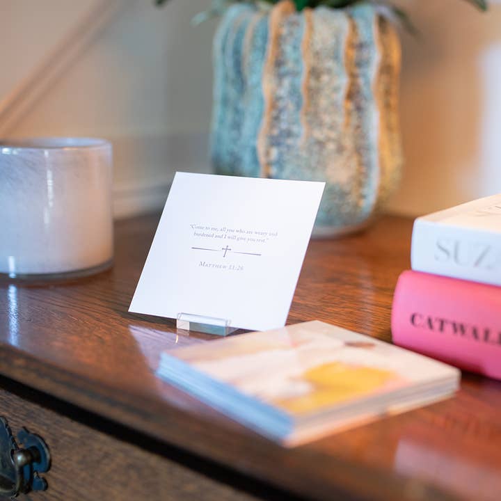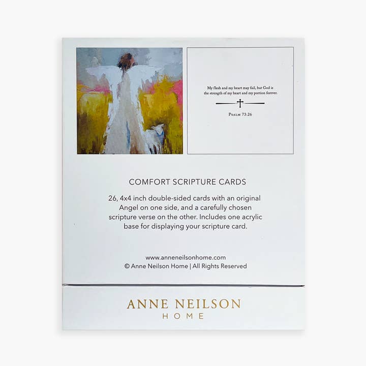 Designed to be a source of strength and comfort, Comfort Scripture Cards feature 26, 4x4 inch double-sided cards with an original Angel on one side, and a carefully chosen scripture verse on the other. Each set comes with one acrylic base for displaying the scripture cards.