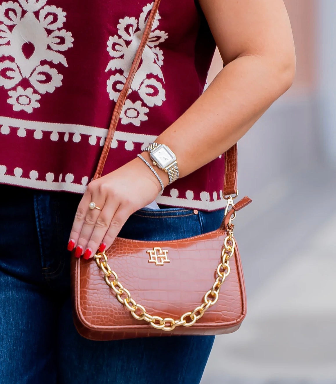 This fabulous vegan leather crossbody is a wonderful size for travel and everyday wearing! It is made with a embossed, vegan leather that is oh so luxurious. There is a removable chain accent that can also be used as a carrying strap as well. The crossbody strap is adjustable and removable as well. It features the Caroline Hill logo on one side and has a top zipper closure. The interior of the bag has a zippered pocket and two short open pockets as well.