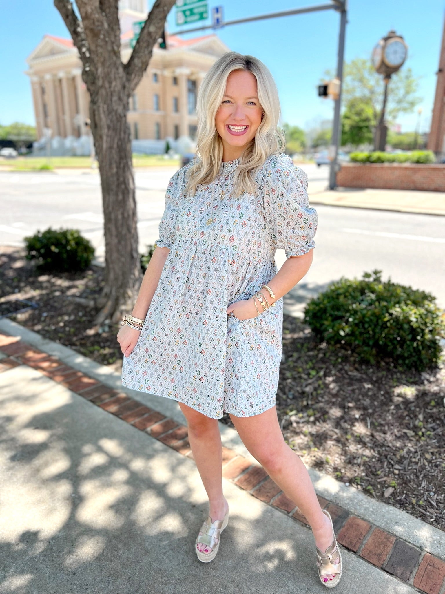 Ruffled high neck mini dress with puff sleeves and ruffle detail.